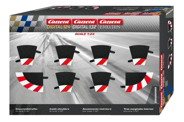 Vnitřní krajnice pro zatáčku 1/30° (20590) pro autodráhy EVOLUTION, Digital 132 a Digital 124. V balení je 6ks krajnic. Radius R1 (viz tabulka v záložce Soubory). K vnitřní krajnici pro zatáčku 1/30° (20590) jsou vhodné: Zatáčka 1/30° 20577