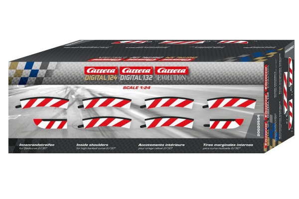 Vnitřní krajnice pro klopenou zatáčku 2/30° (20594) pro autodráhy EVOLUTION, Digital 132 a Digital 124. V balení je 6ks. Radius R2 (viz tabulka v záložce Soubory). K vnitřní krajnici pro klopenou zatáčku 2/30° (20594) jsou vhodné: Klopená zatáčka 2/30° 20575
