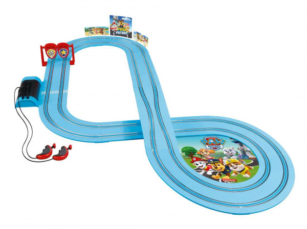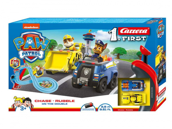 Autodráha Carrera FIRST dlouhá 2,9m s auty ze seriálu Tlapková patrola, pro děti od 3 let, na baterie, obsahuje rovinky, zatáčky, zúžení dráhy pro možné srážky, točící brána, ovladače a dekorace s tématikou Paw Patrol.