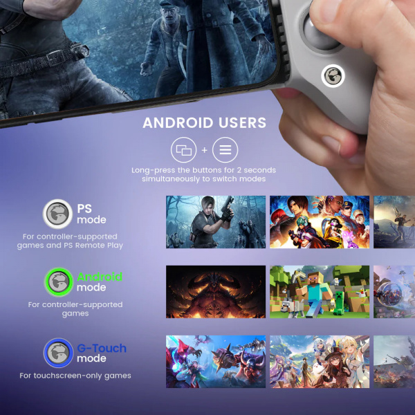 Универсальная совместимость: Благодаря расширяемой перемычке и достаточному пространству на задней панели GameSir G8 Galileo подходит к вашему устройству, будь то iPhone 15 или любой телефон на базе Android.